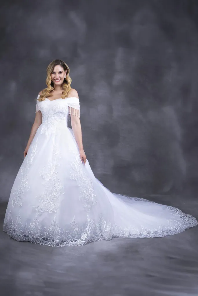 Vestido de Novia con corte princesa, corte de busto tipo africano con cuencas en caída.