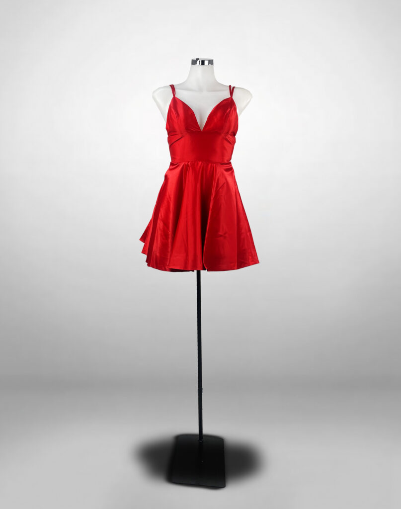 Vestido corto, en color rojo, tirantes delgados, escote corazón falda corta.