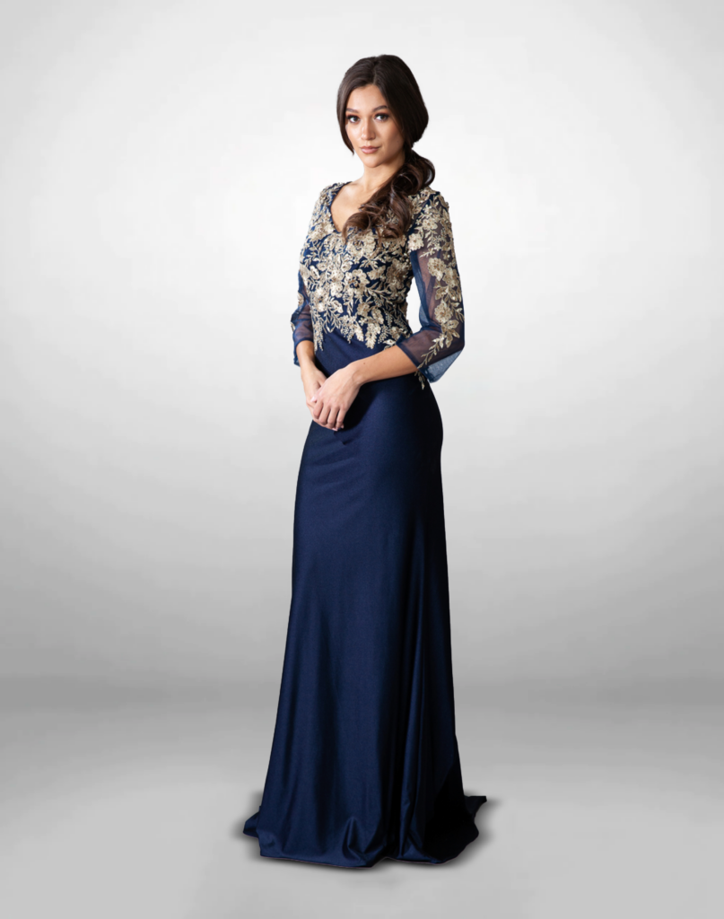 Vestido de dama falda larga color azul.