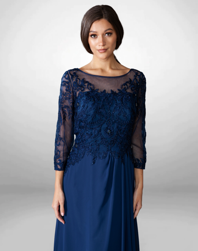 Vestido largo de color azul fuerte, falda larga y fluida.