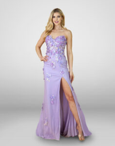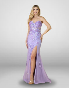 Vestido corsé sin tirantes con apliques florales, de falda larga y fluida color lila, con abertura de pierna y aplicaciones.