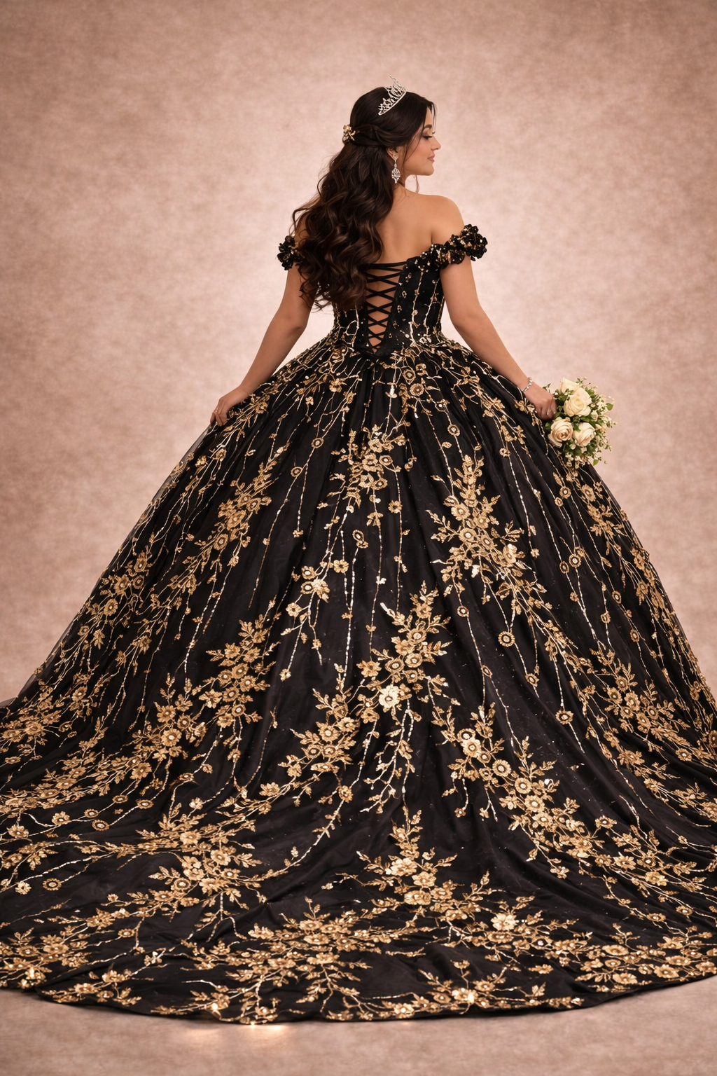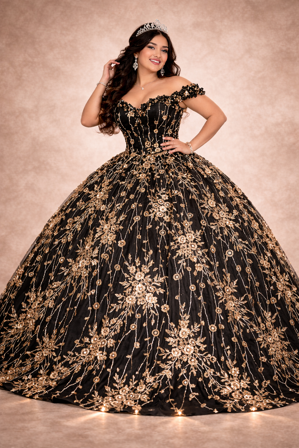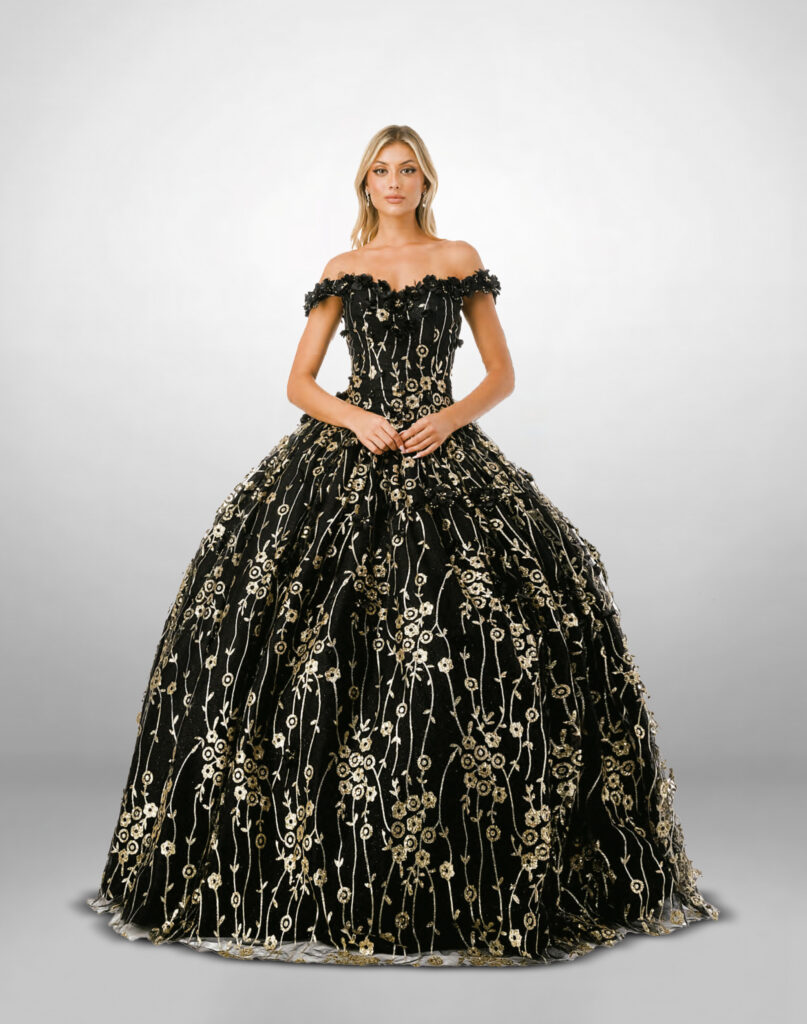 Vestido de XV color negro con detalles de aplicación en color dorado.