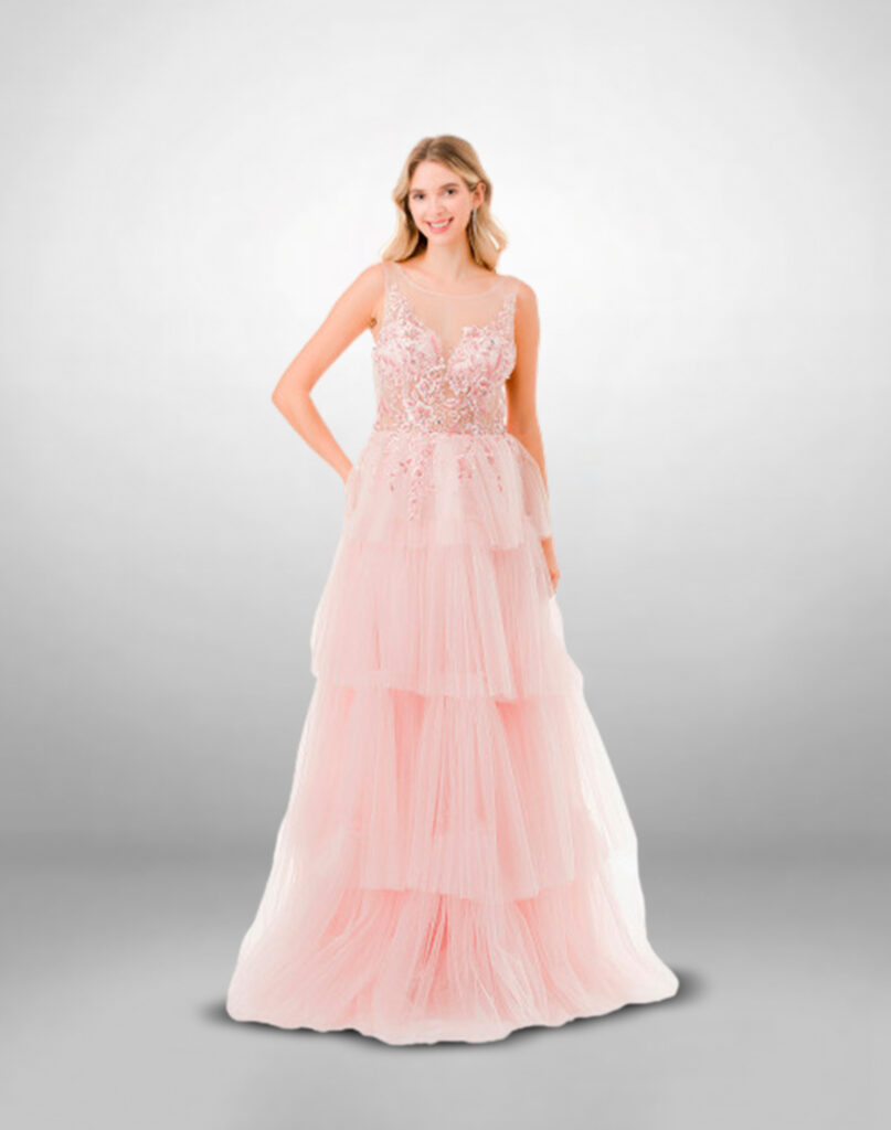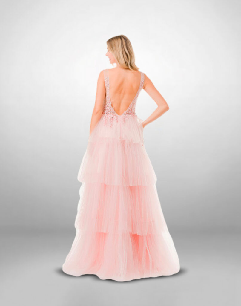 Vestido largo color rosa con detalles de aplicación en el torso.