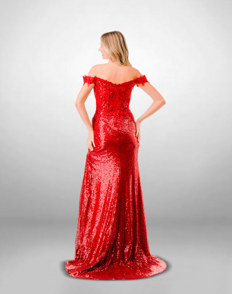 Vestido largo color rojo, abertura en pierna, escote corazón de hombros caídos