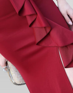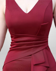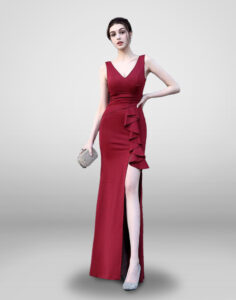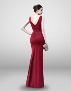 Vestido largo con corte de sirena color azul liso, sin mangas, escarolado y abertura de pierna izquierda y drapeado de cintura.