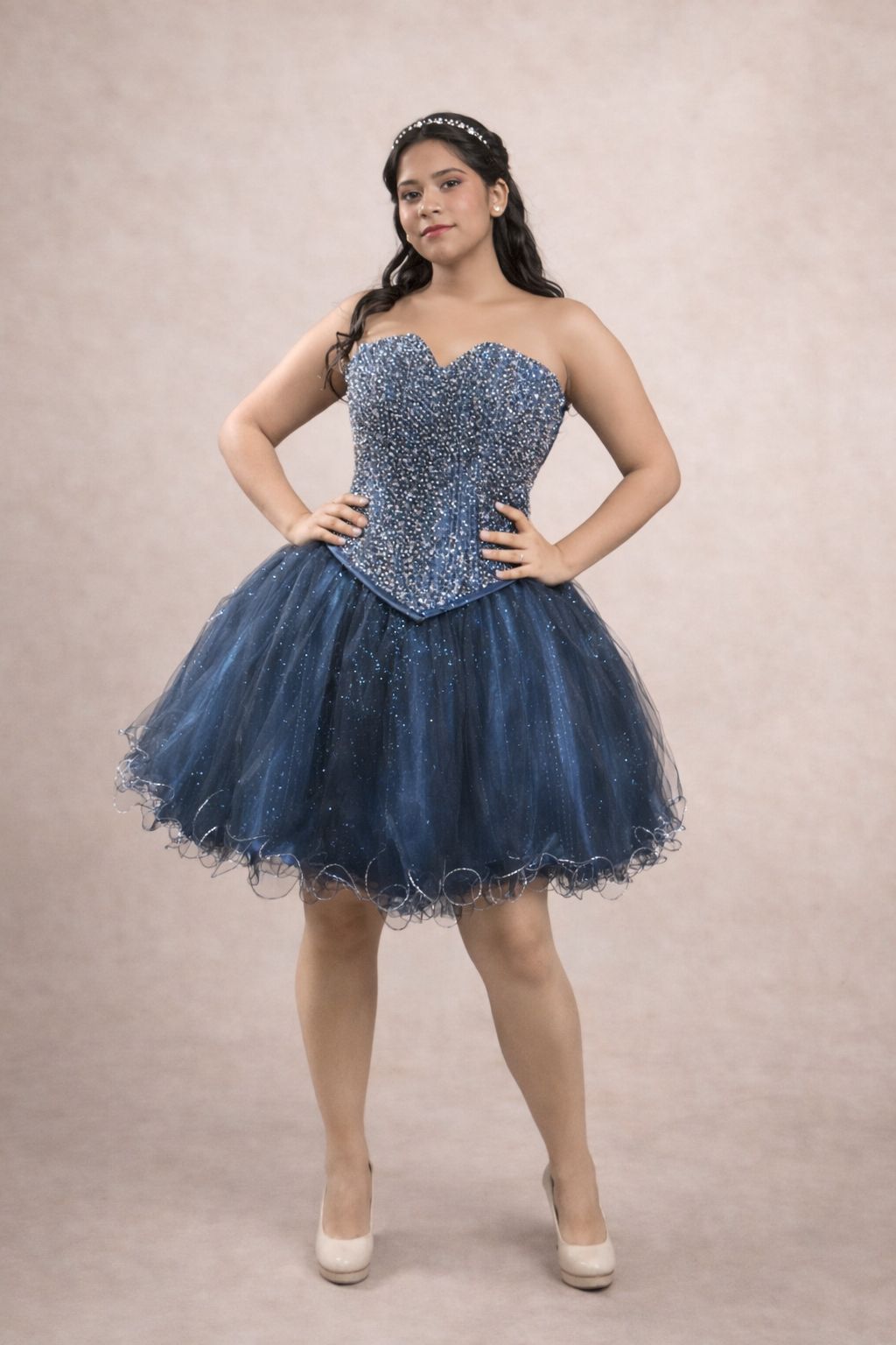 Vestido de xv años strapless, dos piezas largo y corto en color azul rey