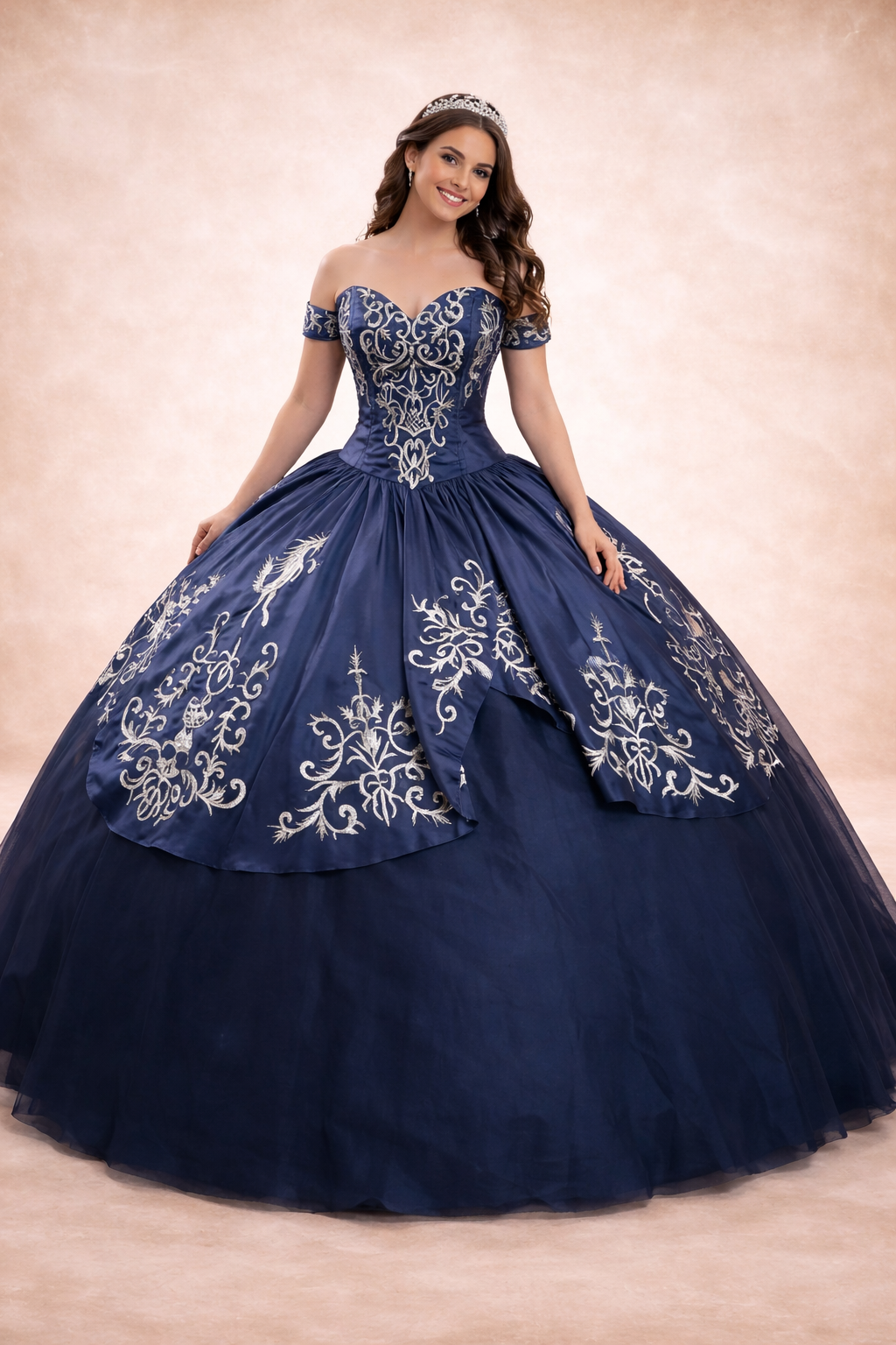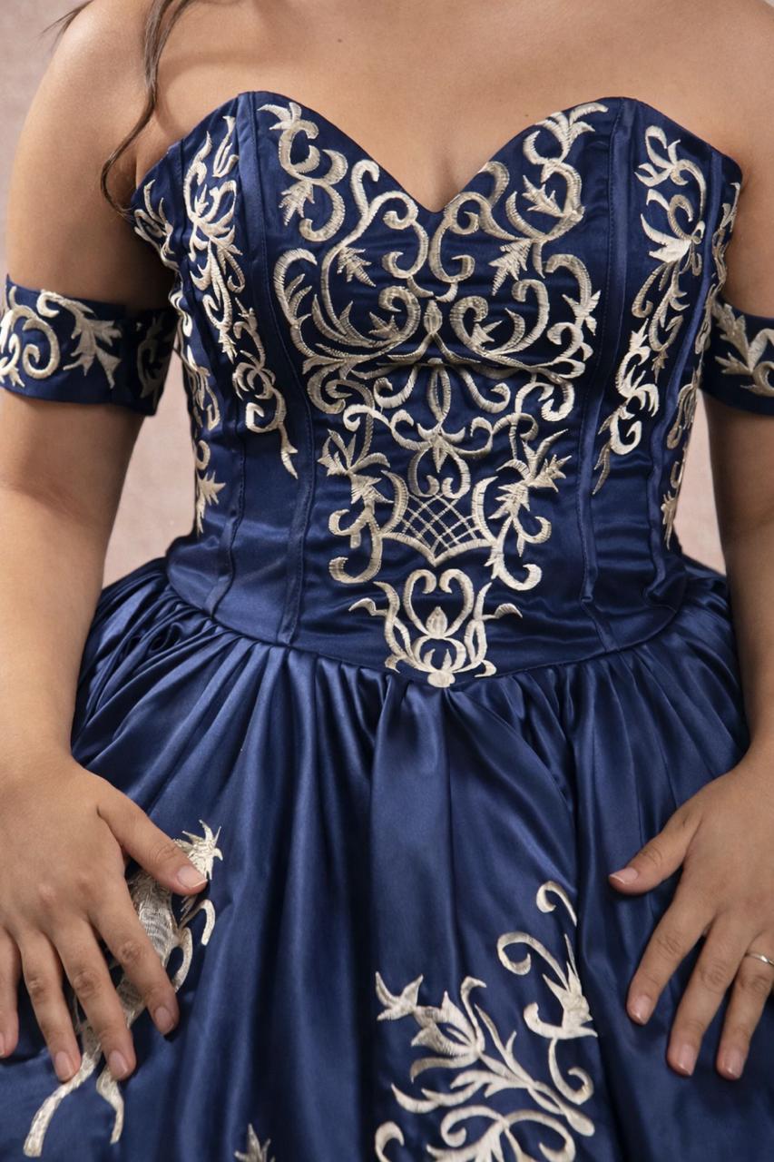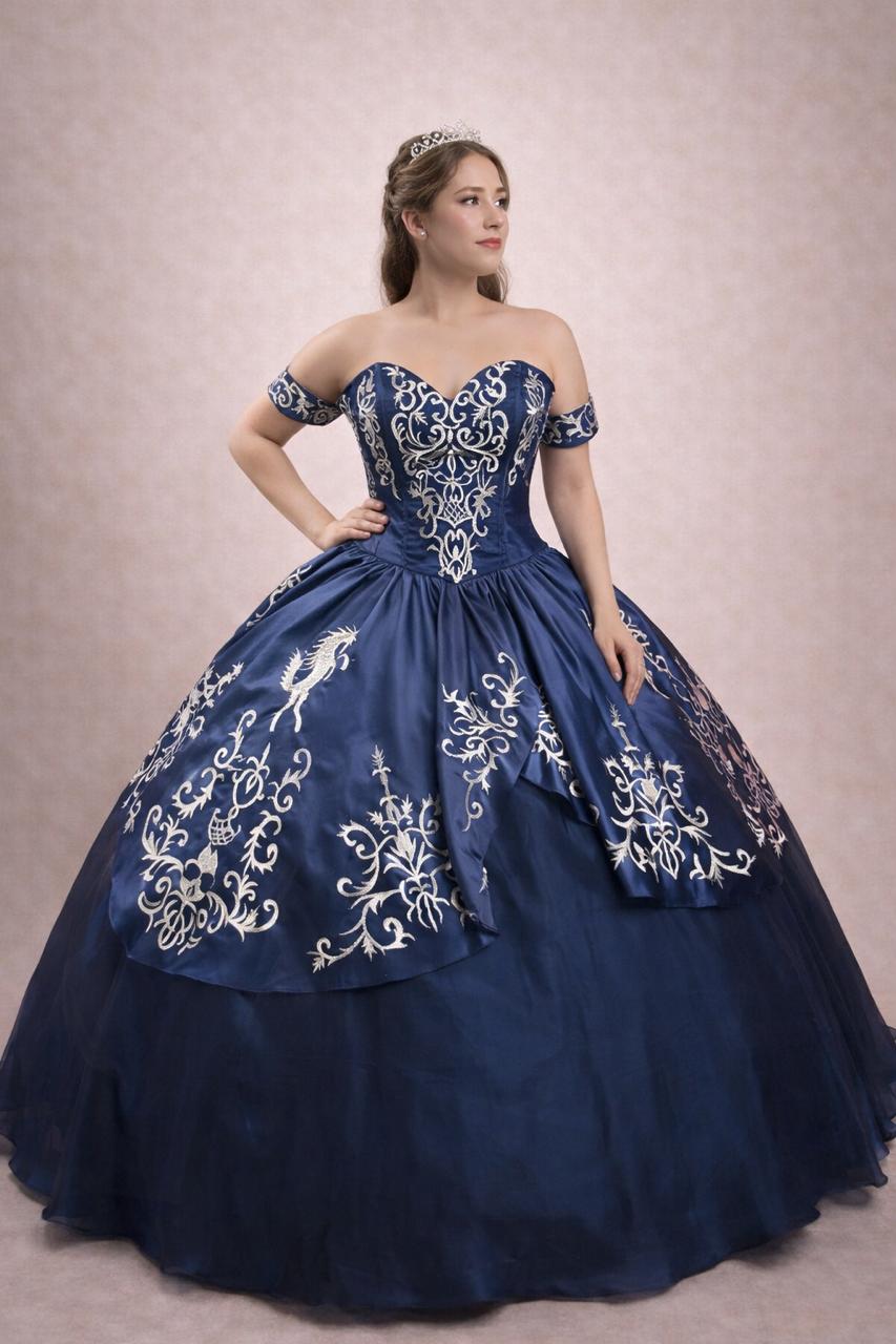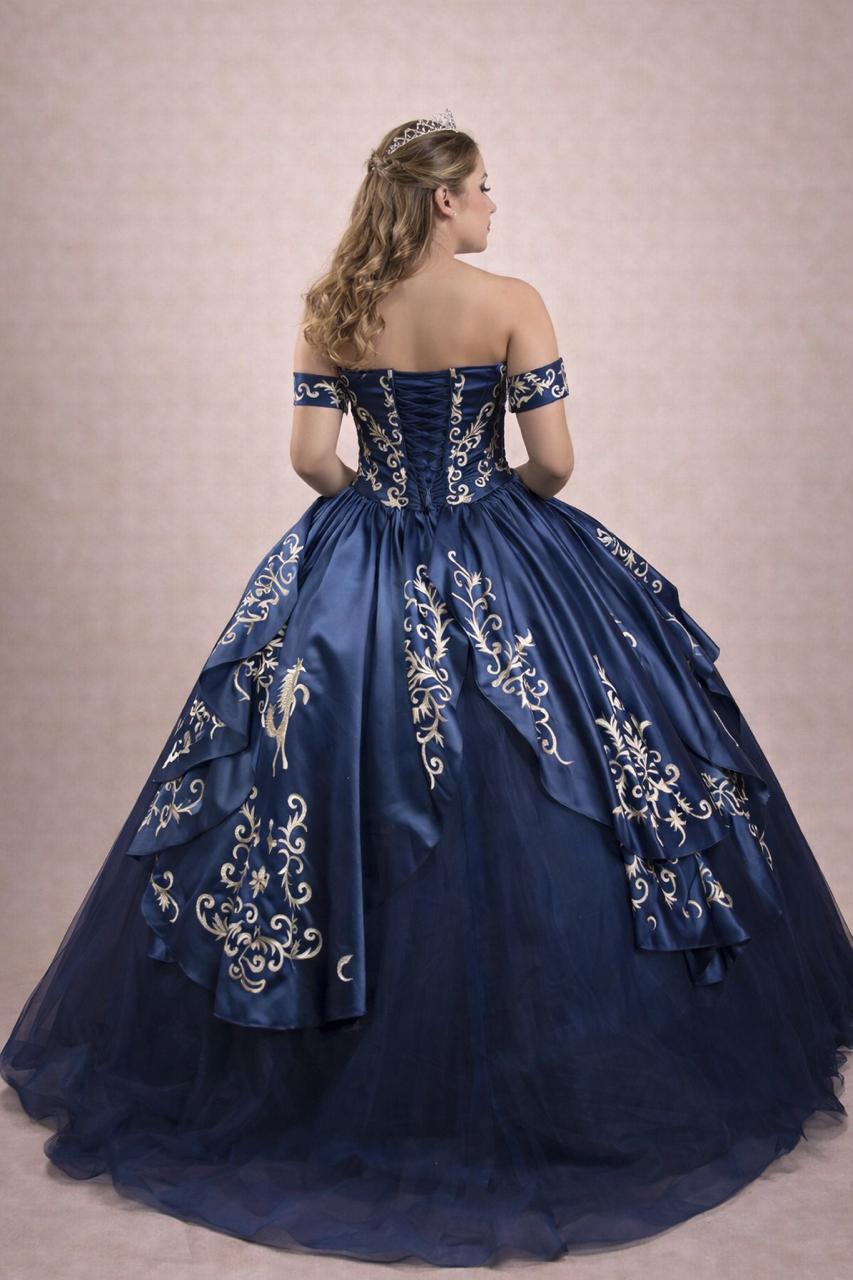 Vestido de xv años de color marino, tipo charro 100{700b399e86ed6929382423551d1b71b0b2a23b8014eb8b08d6a334d07a7a3282} mexicano para de la mejor calidad. Bordados dorados en formas de caballos y de charrería.