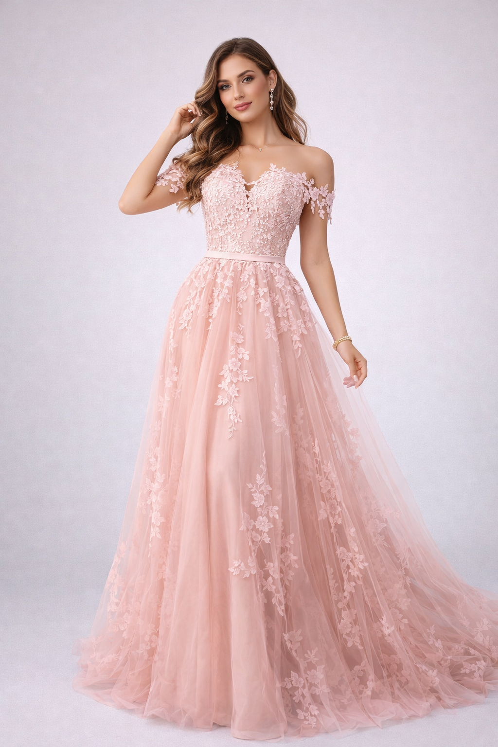 Vestido largo color rosa, con bordado y hombros descubiertos. Escote en forma de corazón, con una abertura profunda al centro, con botones en la espalda y cinta a la cintura para realzar la figura. Disponible en talla 10. Ideal para graduaciones, cenas de gala, bodas, XV años o para lucir espectacular en cualquier evento elegante.