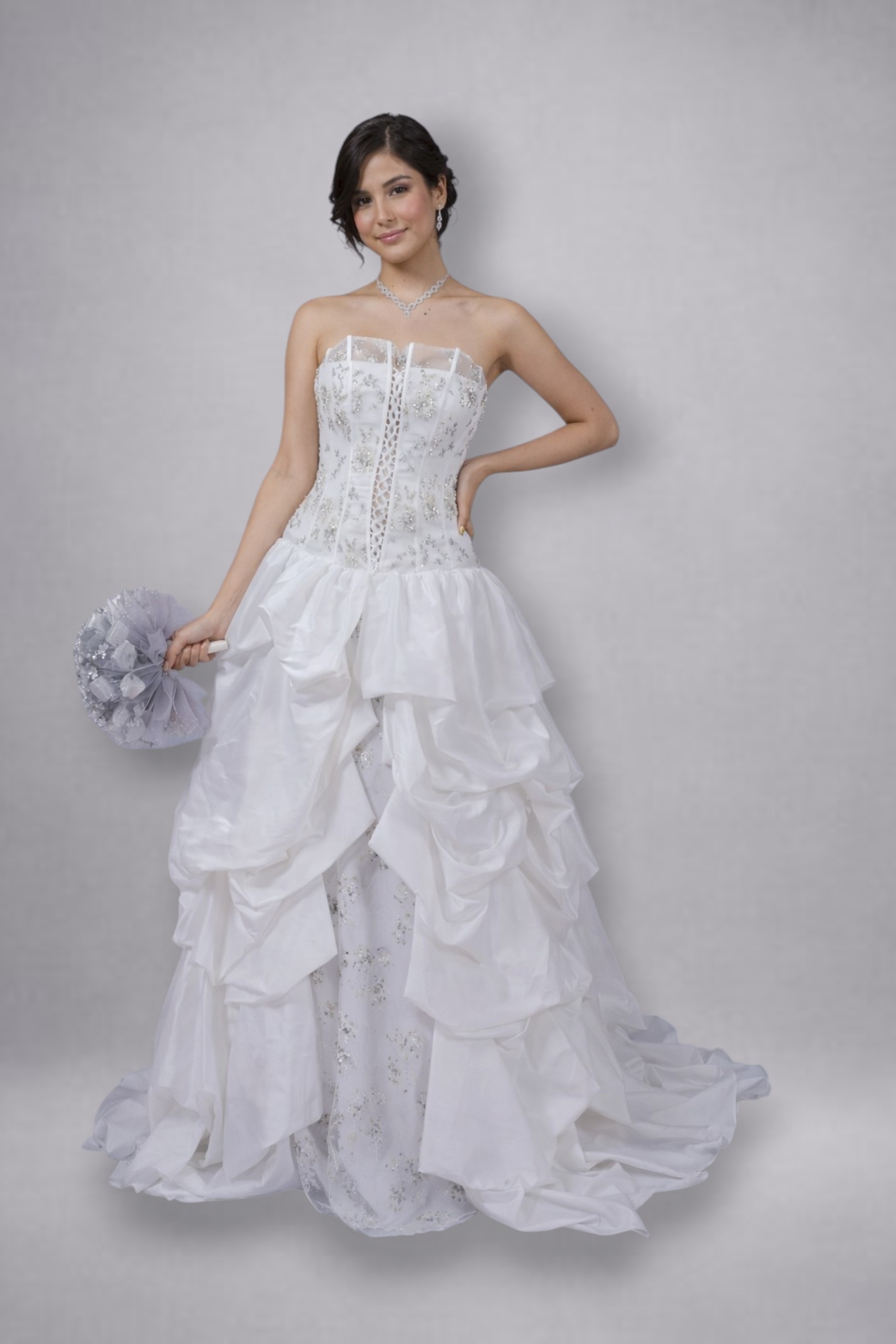 Vestido de Novia largo corte en linea A en tela suave con forro y encaje en la parte superior.