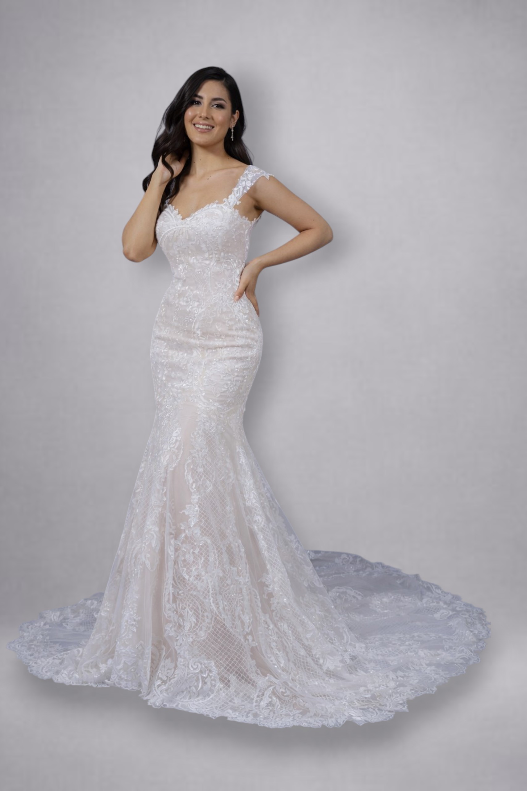Vestido de Novia largo forma cola de sirena en tela de encaje muy suave con manga off shoulder y forro rosa