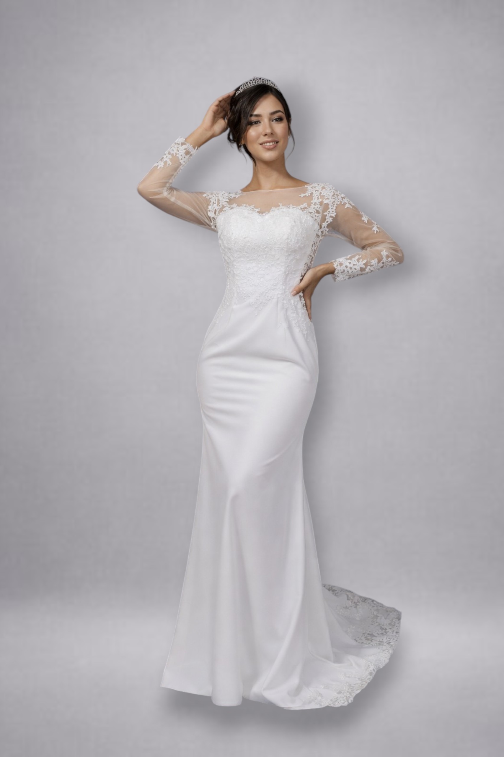 Vestido de Novia largo forma cola de sirena en tela suave con forro y encaje en la parte superior y manga larga transparentes.