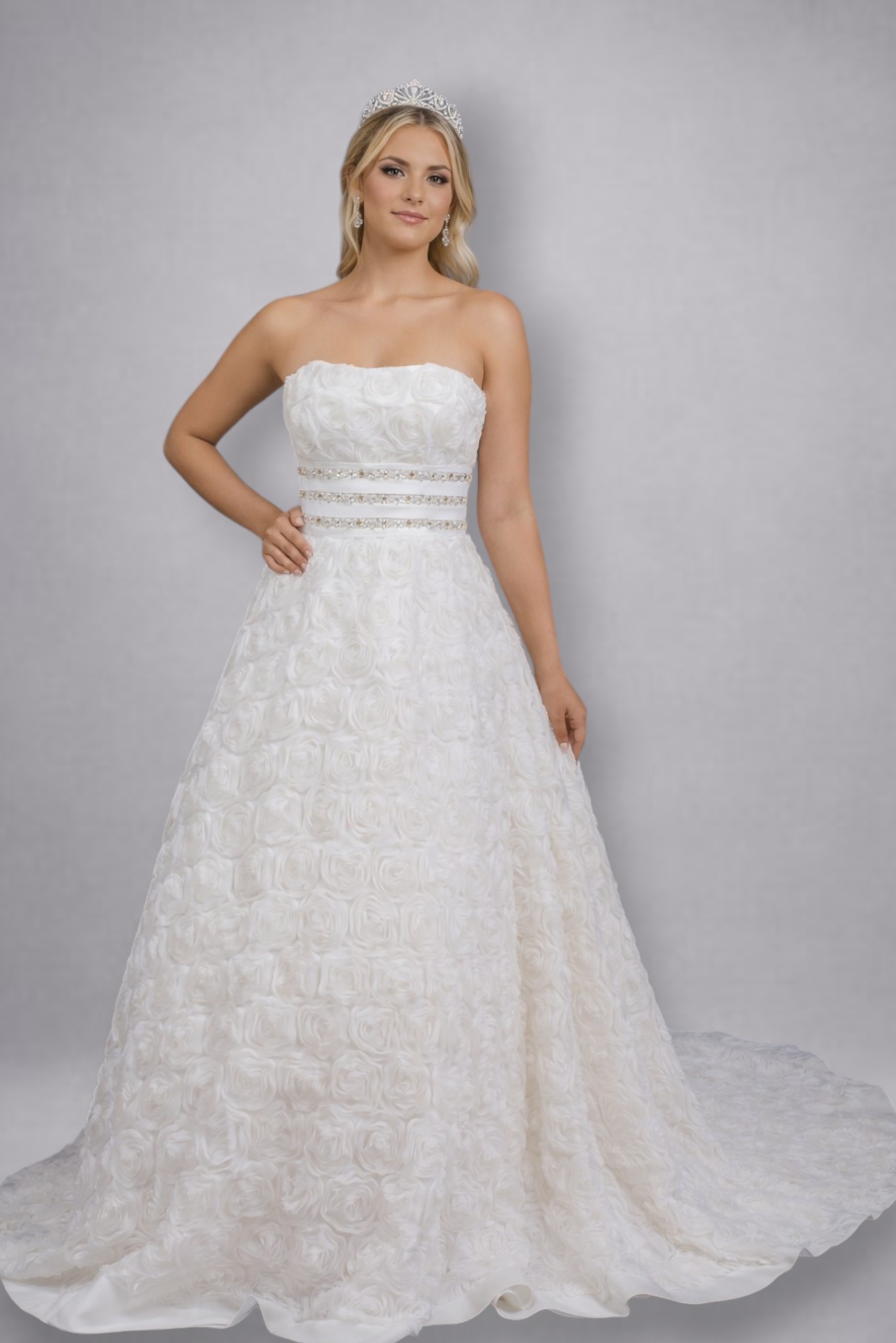 Vestido de novia largo corte línea A en tela de flores 3d de la mejor calidad, aplicación de perlas en la cintura del vestido. strapless