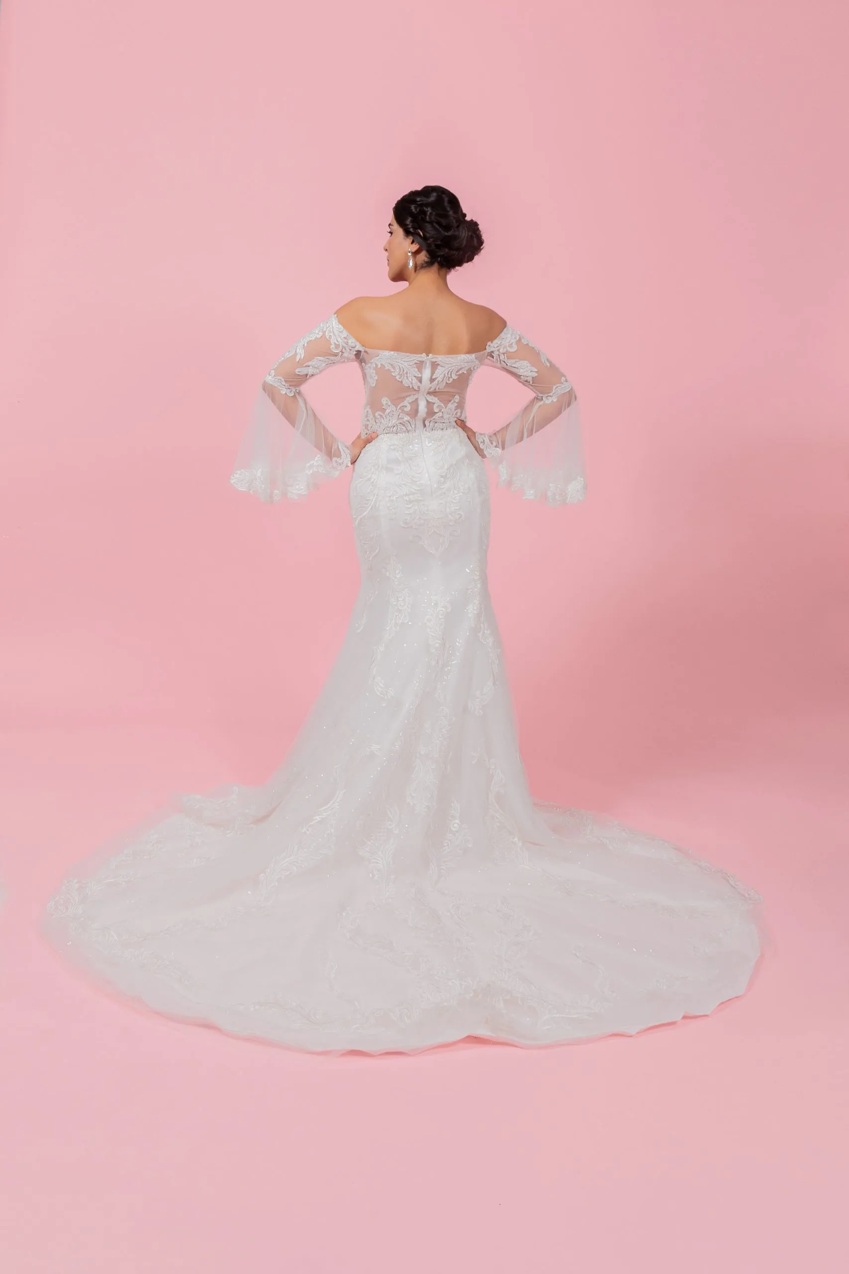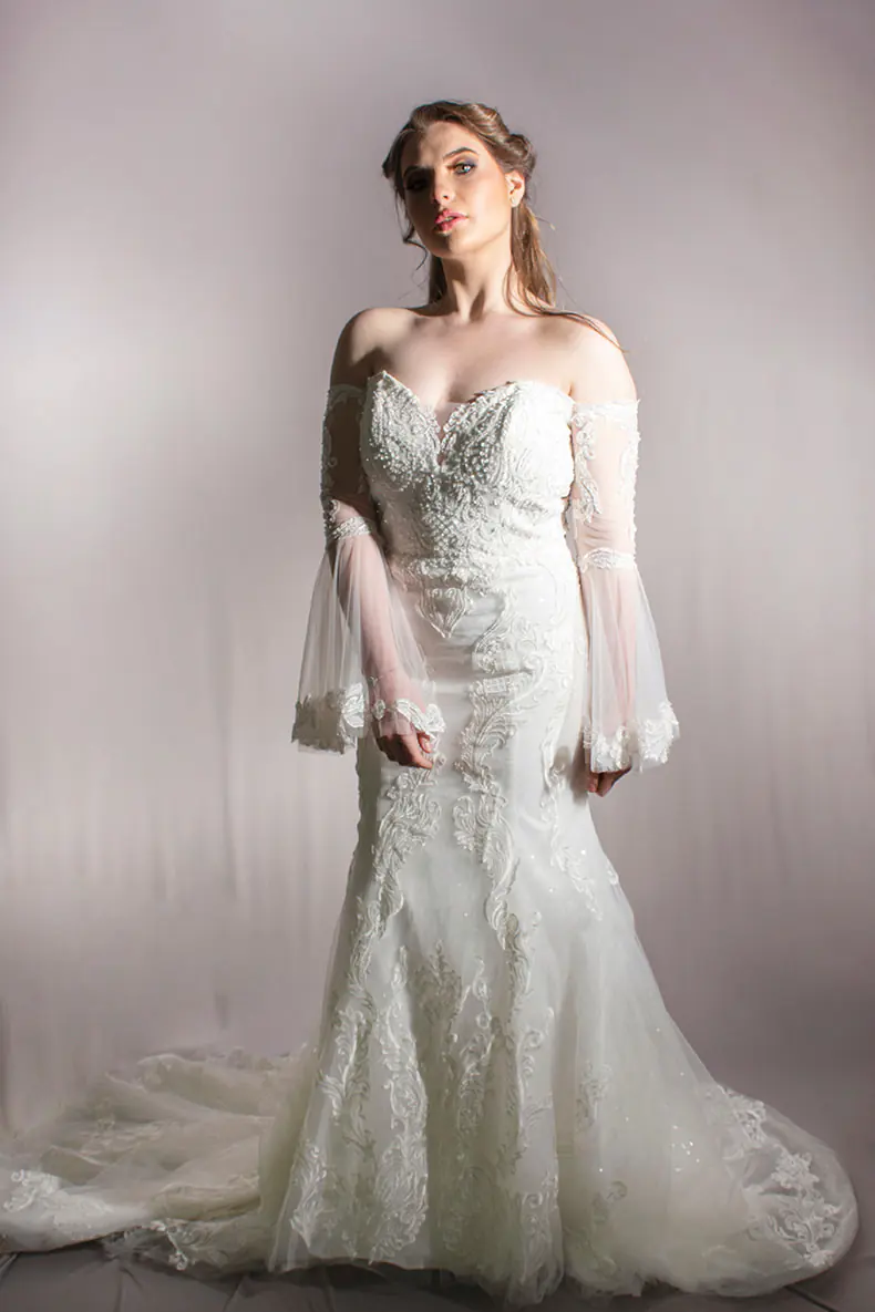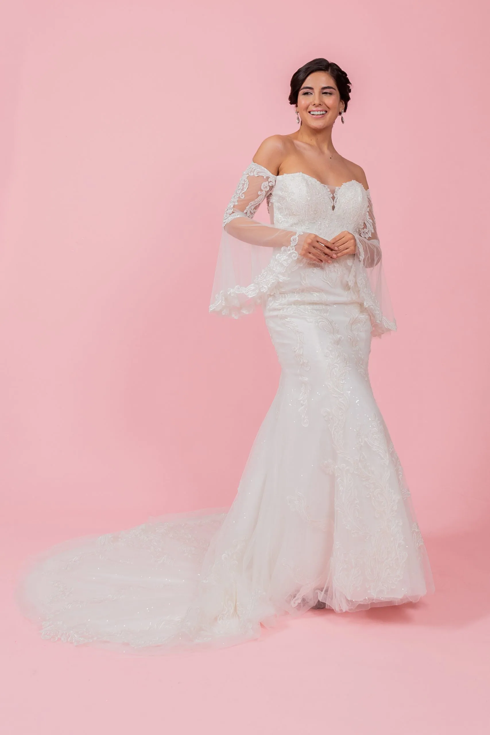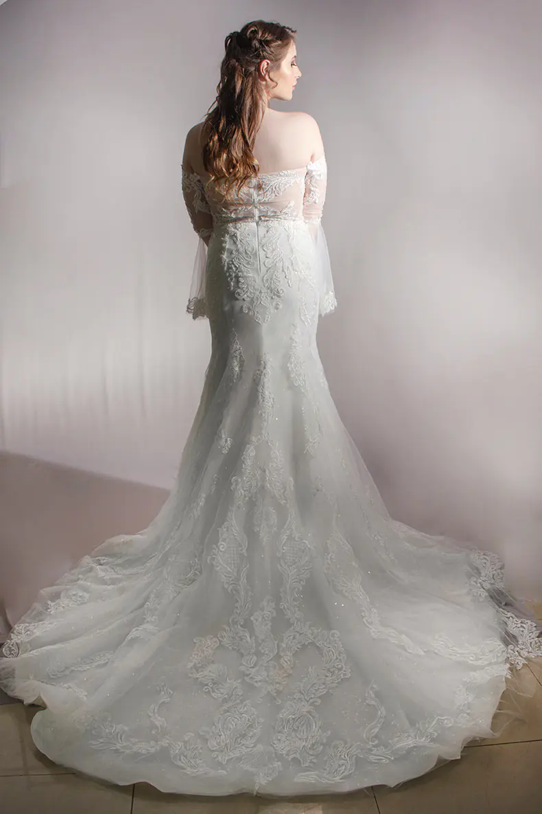 Vestido de novia largo corte cola de sirena con lentejuela y cola en tela de la mejor calidad, aplicación de cristales en todo el vestido. off shoulder