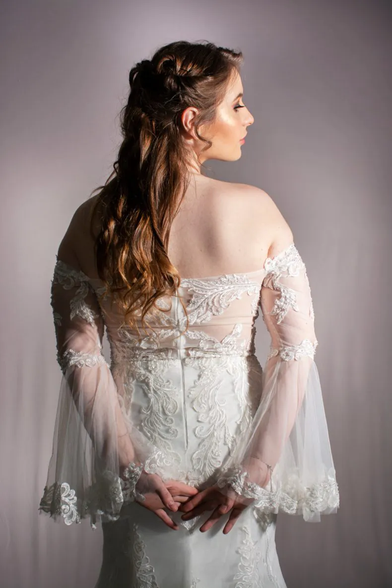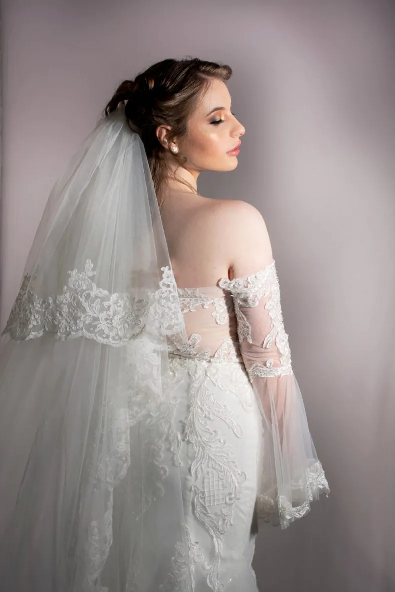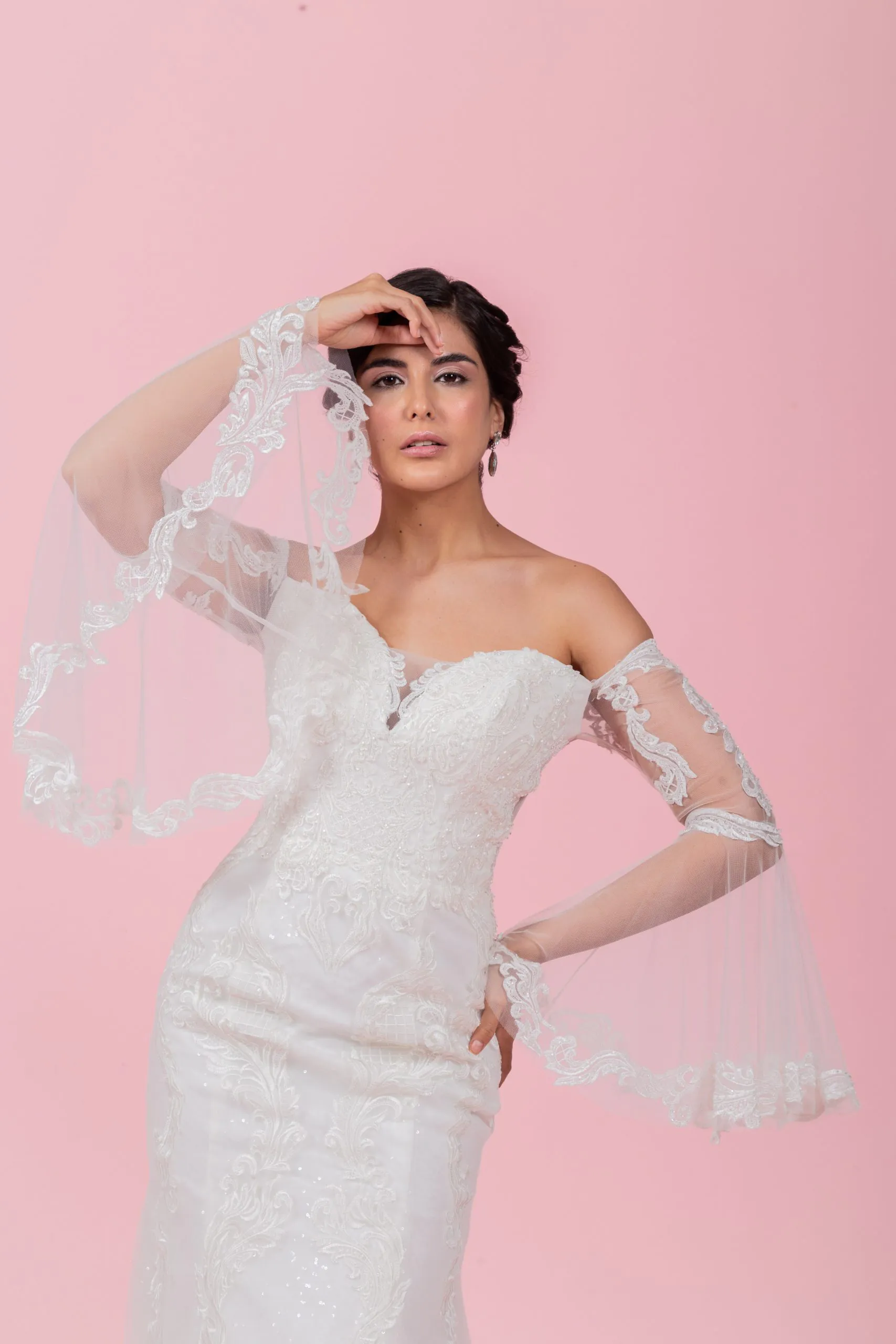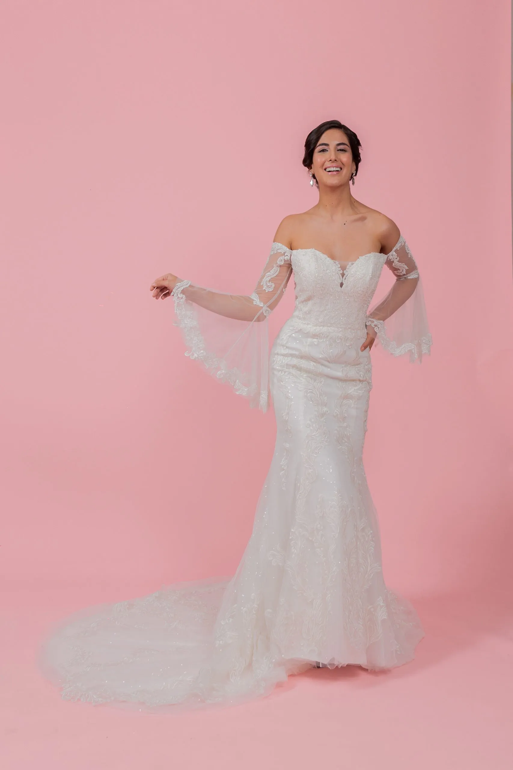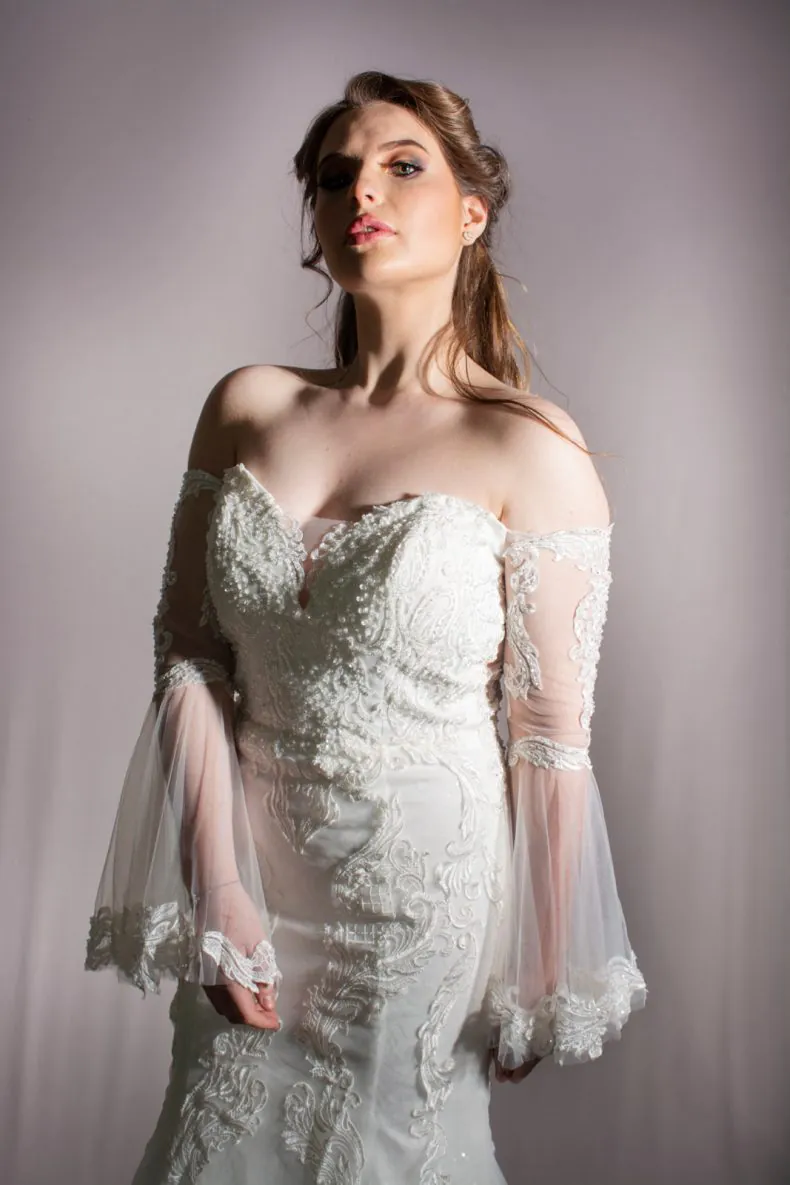 Vestido de novia largo corte cola de sirena con lentejuela y cola en tela de la mejor calidad, aplicación de cristales en todo el vestido. off shoulder