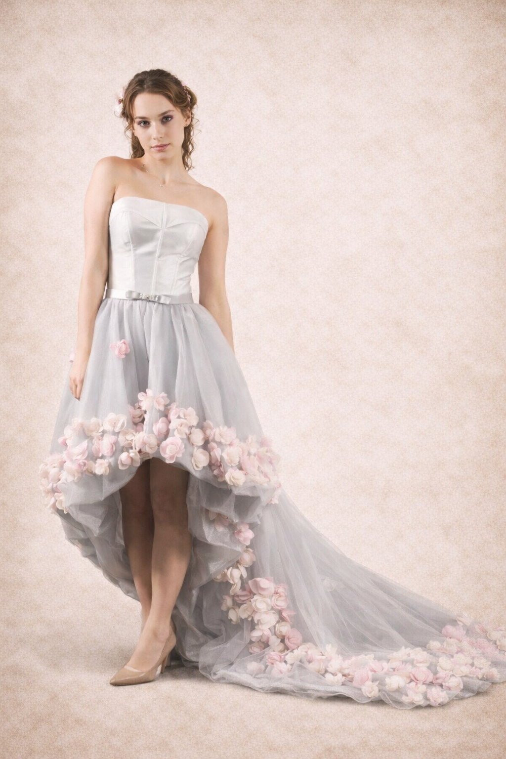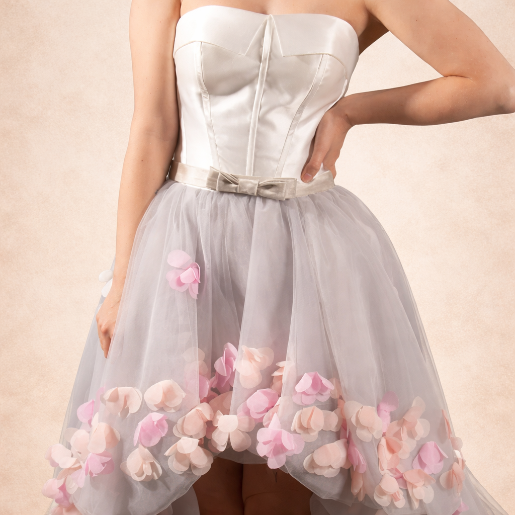 Romántico vestido de xv años, con cola al suelo, color blanco con fondo gris y flores color rosa en 3D. Por el frente, la falta llega arriba de la rodilla, con escote en corazón y una cinta con moño que resalta la cintura. Ideal para mujeres jóvenes, de estilo romántico y coqueto; úsalo en fiestas de XV años, cocteles, graduaciones, para damas de honor, bodas por el civil, sesiones de fotos y cualquier otro evento donde quieras destacar tu belleza. Combínalo con zapatillas o sandalias plateadas y luce espectacular.