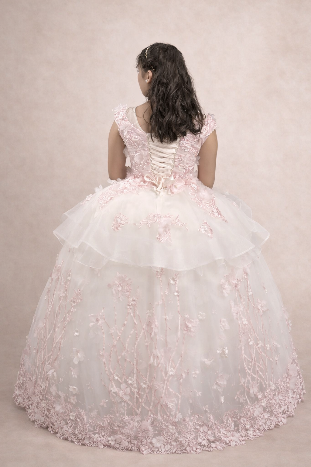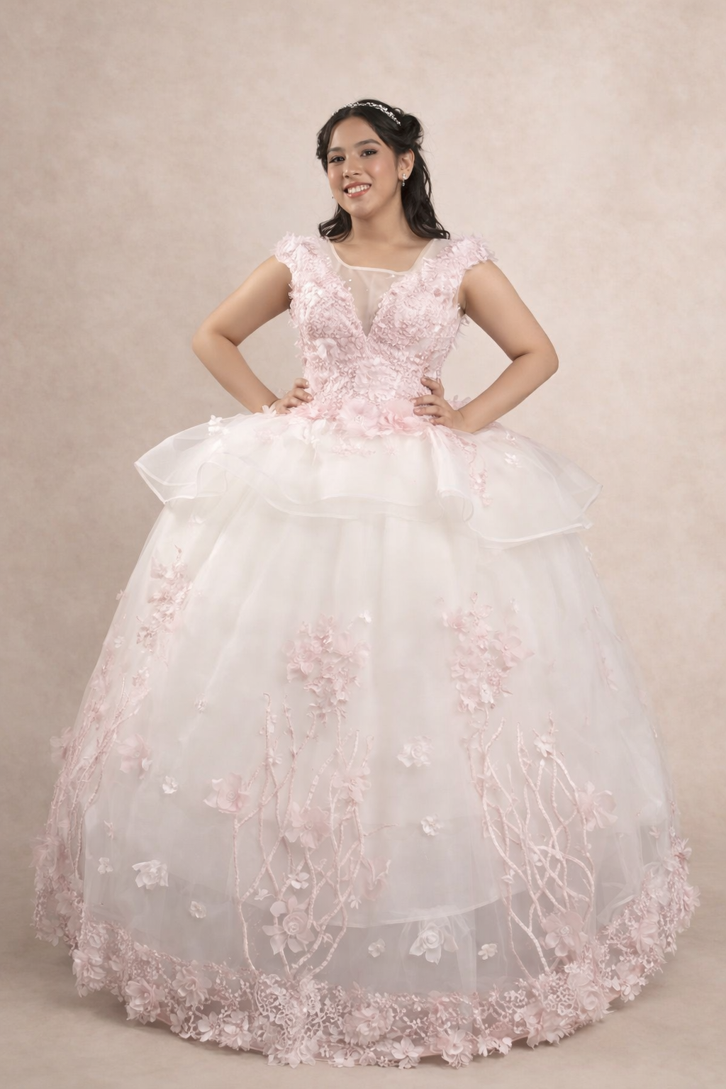 Vestido de xv años manga caída, en color rosa/beige, corset ajustable con aplicación de flores 3D y encaje al tono de la mejor calidad