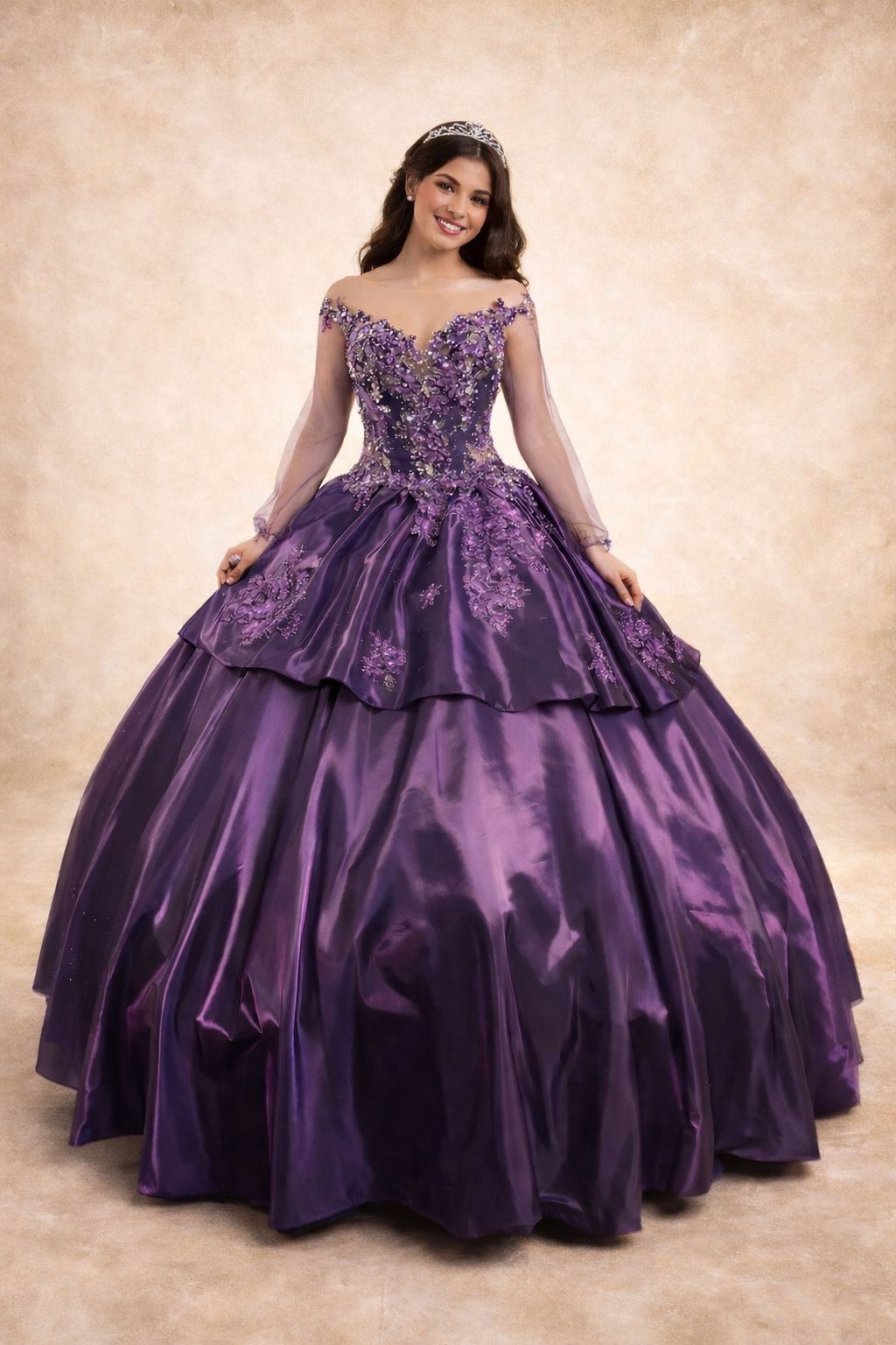 Vestido de xv años de mangas transparentes color piel, en color morado, corset con bordado y pedreria de la mejor calidad. cola en el vestido de un metro con bordados