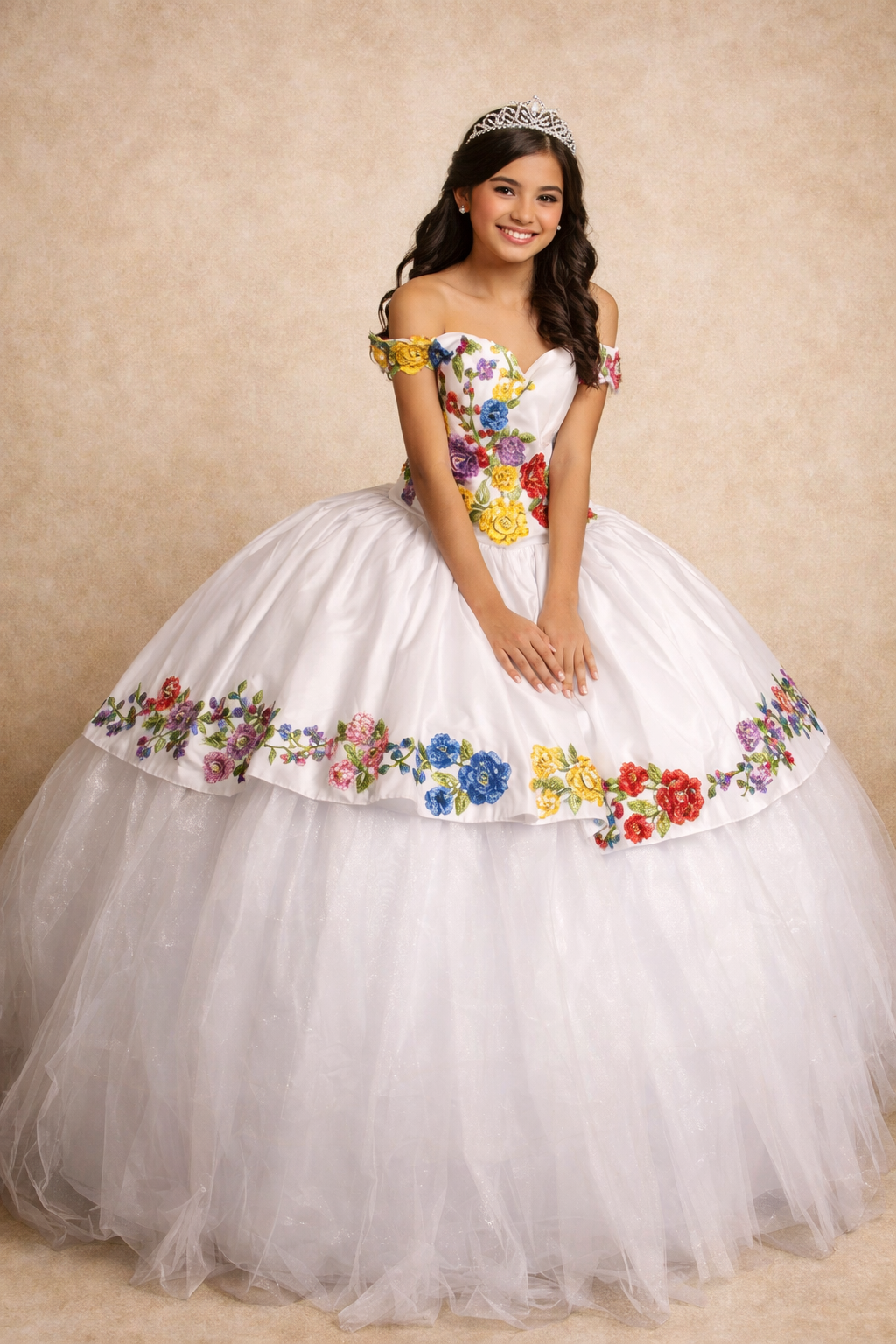 Vestido de xv años de largo corte princesa manga off shoulder escote corazón en color blanco con rosas de colores, corset con aplicaciones y flores 3D de la mejor calidad.