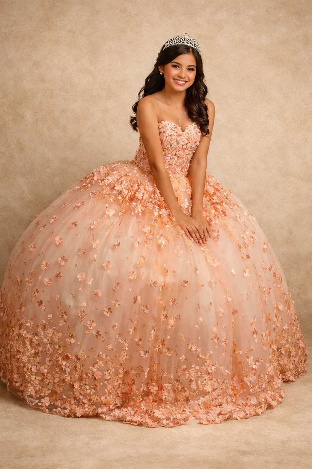 Vestido de xv años de largo corte princesa strapless escote corazón en color Blush durazno, corset con aplicaciones bordadas y flores 3D de la mejor calidad