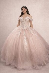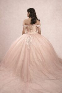 Vestido de xv años de de manga off shoulder en color rosa coral , corset con bordado y adornos de la mejor calidad