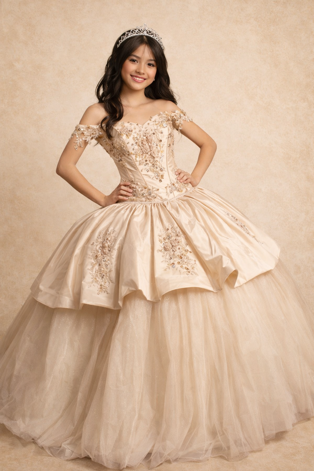 Vestido de xv años de largo corte princesa de tirantes escote corazon en color Beige, corset con aplicaciones y flores 3D de la mejor calidad