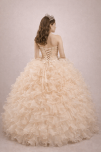 Vestido de xv años color champagne strapless con aplicación al tono