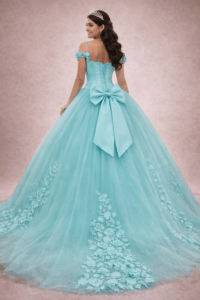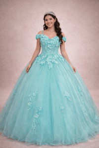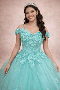 Vestido de quinceañera color verde agua con flores 3D que simulan una caída de la cintura a los pies, corset, que da figura y estiliza la parte superior del vestido con un corte en v, sin mangas.